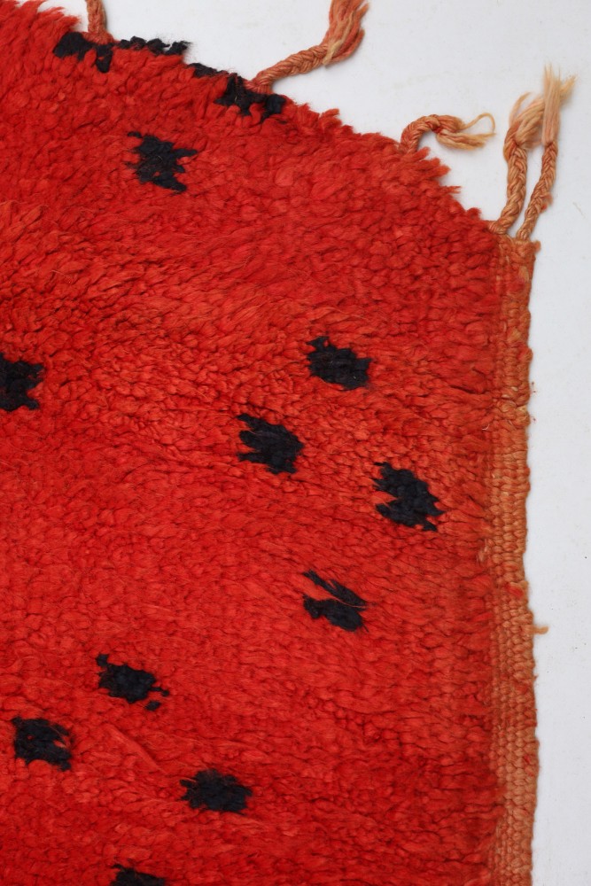 Ce tapis berbère que l'on appelle Boujad tient son nom de la région de Boujad au Maroc où il a été confectionné à la main sur un métier à tisser traditionnel en bois. Ses motifs représentent les humeurs, les amours, les peines de la tisseuse au moment de sa création. Ils sont reconnaissables par leurs couleurs patinés par le soleil et ceux sont des pièces qui apportent beaucoup de caractère à un intérieur.
