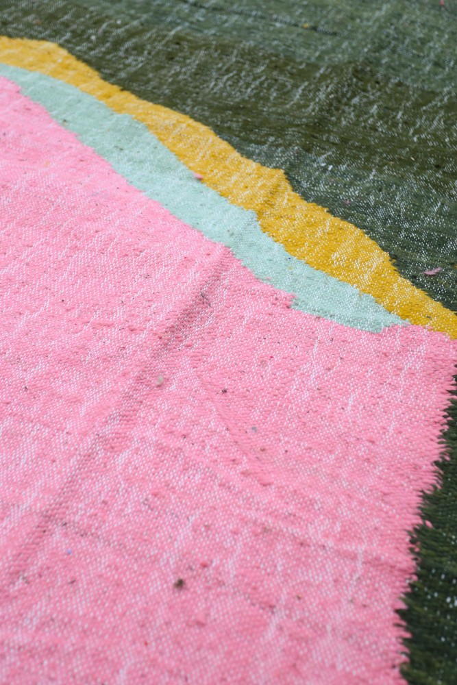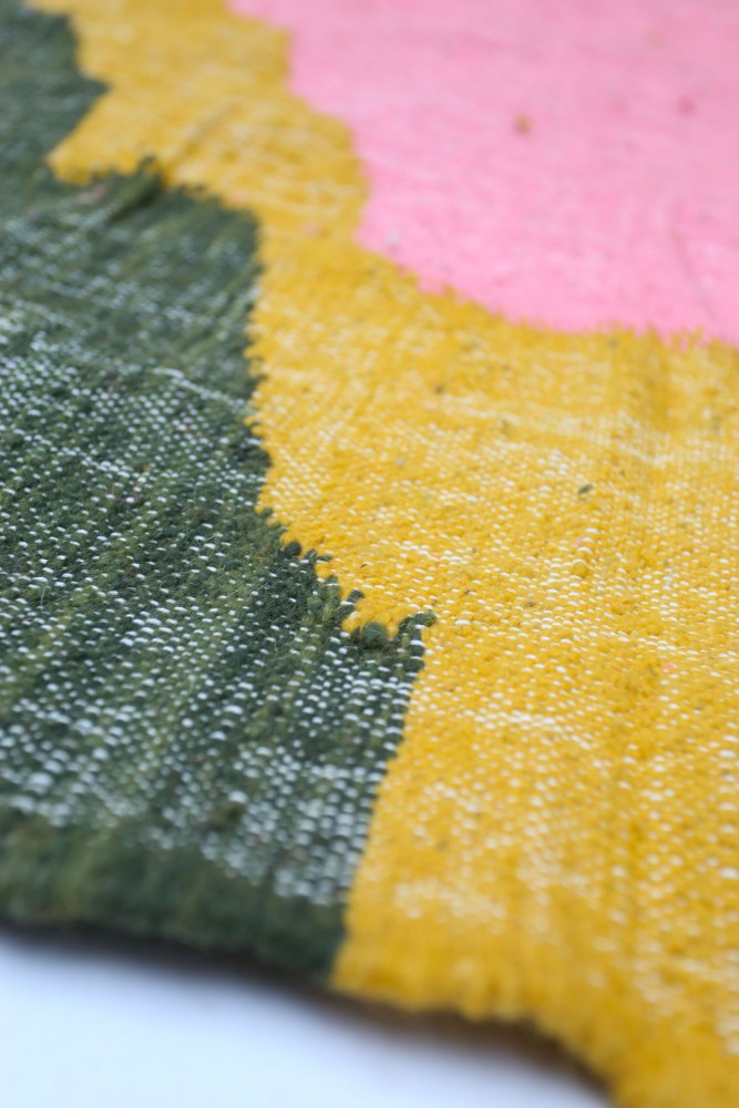 Très grand tapis berbère Kilim moderne en laine vert rose jaune