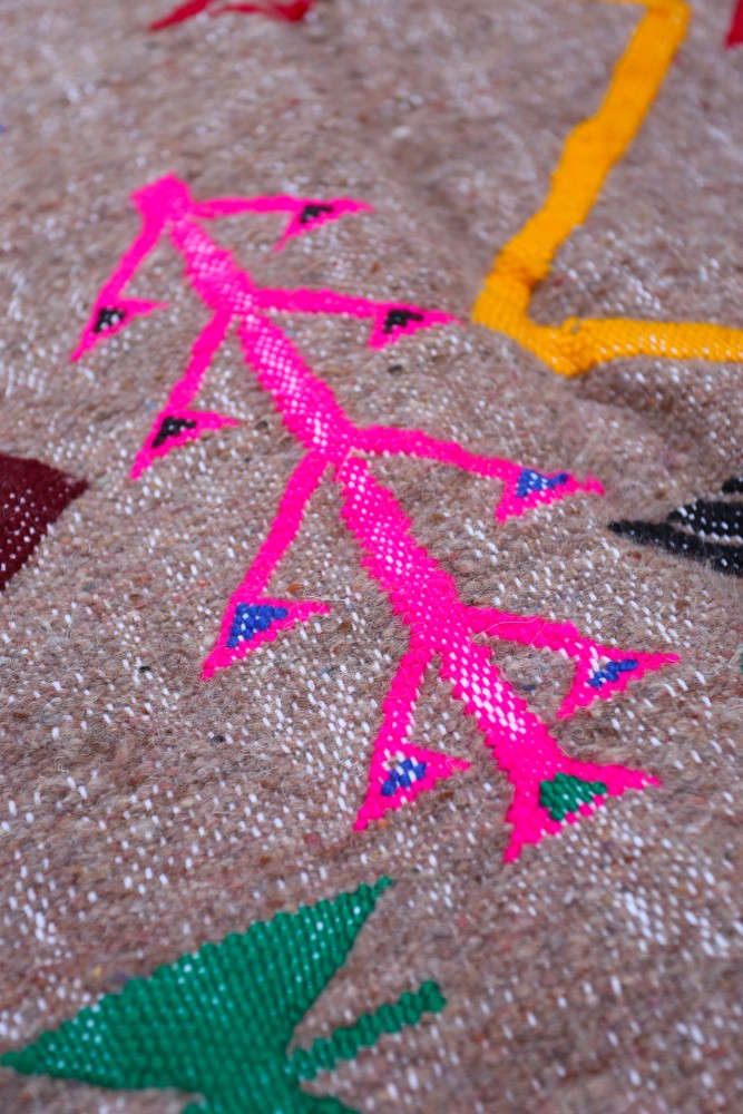 Ce tapis berbère que l'on appelle Azilal tient son nom de la région d'Azilal au Maroc où il a été confectionné à la main sur un métier à tisser traditionnel en bois. Ses motifs représentent les humeurs, les amours, les peines de la tisseuse au moment de sa création. Une fois ce tapis berbère coloré créé, elle en confectionnera un autre totalement différent, en fonction de ses émotions du moment. Chaque pièce est donc unique.