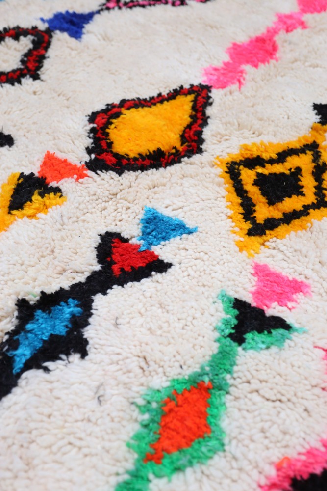Se desideri trovare un tappeto berbero colorato, devi rivolgerti ai tappeti Azilal, ai tappeti Boucherouite, ai tappeti Boujad o ai tappeti Kilim. Si tratta dei nomi di tribù che vivono nell'Atlante marocchino e che realizzano tappeti con caratteristiche proprie. Ad esempio, i tappeti Boujad sono realizzati con lana o tessuti riciclati (come anche i tappeti Boucherouite), il che permette di ottenere motivi distorti e originali. I tappeti Azilal si distinguono per i motivi grafici e colorati su uno sfondo écru, crema o beige. Il tutto offre un contrasto naturale e mette in risalto le diverse tonalità. Il tappeto Kilim è tessuto piatto, con particolari motivi geometrici. In tutti i casi, otterrai un tappeto marocchino colorato bello e resistente. Hai la possibilità di scegliere tra motivi più o meno presenti e colori più o meno vivaci per far sì che il tuo tappeto si armonizzi perfettamente con il tuo interno.