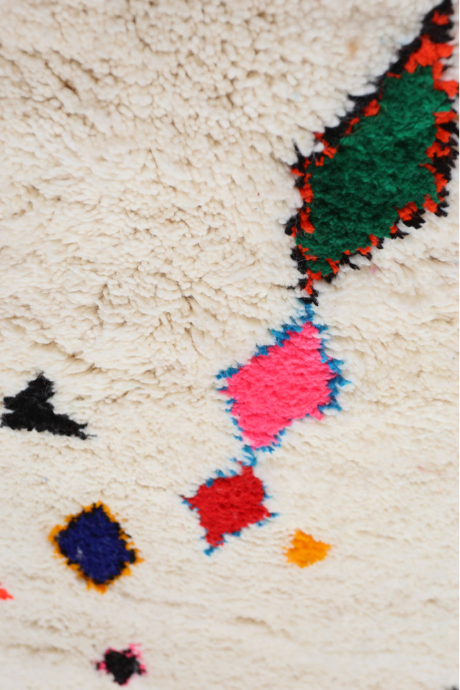 I tappeti Azilal sono realizzati artigianalmente, come tutti gli altri tappeti berberi. Si tratta di una competenza specifica delle donne berbere provenienti dalle diverse tribù del Marocco. Grazie alla tessitura tradizionale marocchina, le donne creano tappeti orientali per uso domestico, con una libertà creativa in termini di forme e colori. Queste tessitrici seguono pienamente le proprie idee e intuizioni: nessun tappeto Azilal è uguale agli altri. Grazie all'espressione artistica di queste donne marocchine, i tappeti...Valorizzano gli spazi abitativi e aggiungono un tocco di luce e originalità.. Un semplice tappeto da corridoio berbero Conferisce un'aura di eccezionalità al suo interno. Una particolare attenzione viene dedicata al tappeto Azilal per garantire finiture di alta qualità, con una lana estremamente morbida. Si tratta di un modello unico, raro e molto ricercato. Sia per decorare un muro che per coprire il pavimento, è un elemento decorativo di primissima scelta.