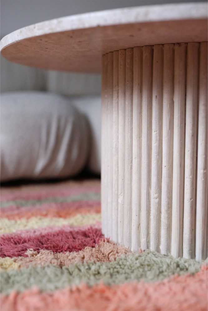 Tavolino in travertino beige realizzato artigianalmente in Marocco, con un piano di 80 cm e un piede rotondo a righe.