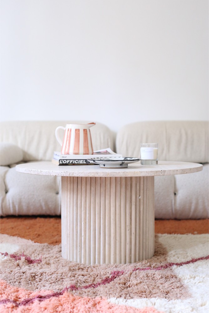 Tavolino da caffè in travertino progettato da Marion, la fondatrice di Them, e realizzato artigianalmente al 100% in Marocco presso uno dei nostri talentuosi laboratori partner.
