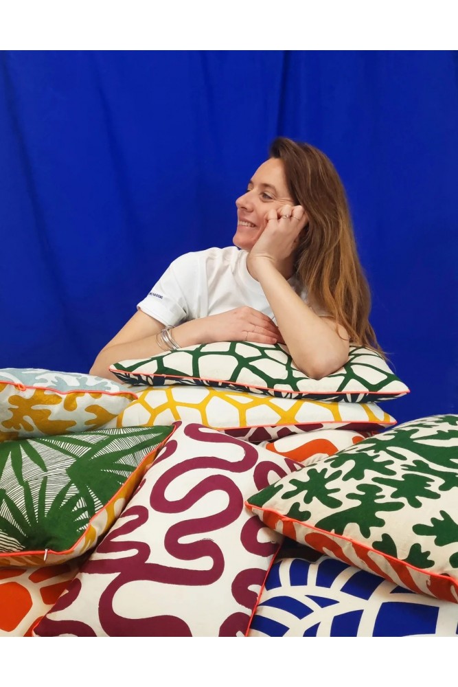 Ogni cuscino è un pezzo unico realizzato a mano nello studio parigino di M3tiss. Tutti i tessuti del marchio sono stampati artigianalmente al telaio. I colori sono realizzati a mano con inchiostro tessile senza solventi, APEO e ftalati.