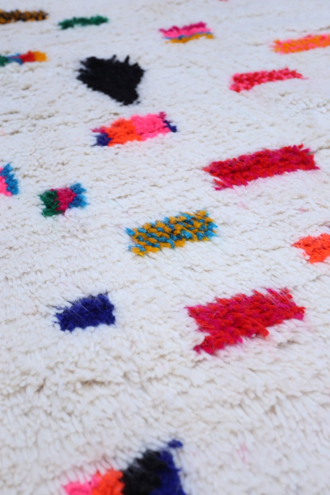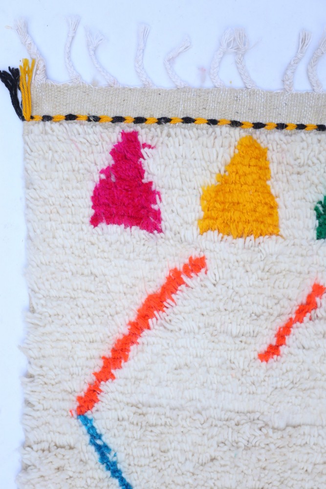 Questo tappeto berbero chiamato Azilal prende il nome dalla regione di Azilal in Marocco dove è stato realizzato a mano su un telaio tradizionale in legno. I suoi motivi rappresentano gli stati d'animo, gli amori, le tristezze della tessitrice al momento della creazione. Una volta creato questo tappeto berbero colorato, ne creerà un altro completamente diverso, in base alle sue emozioni del momento. Ogni pezzo è quindi unico.