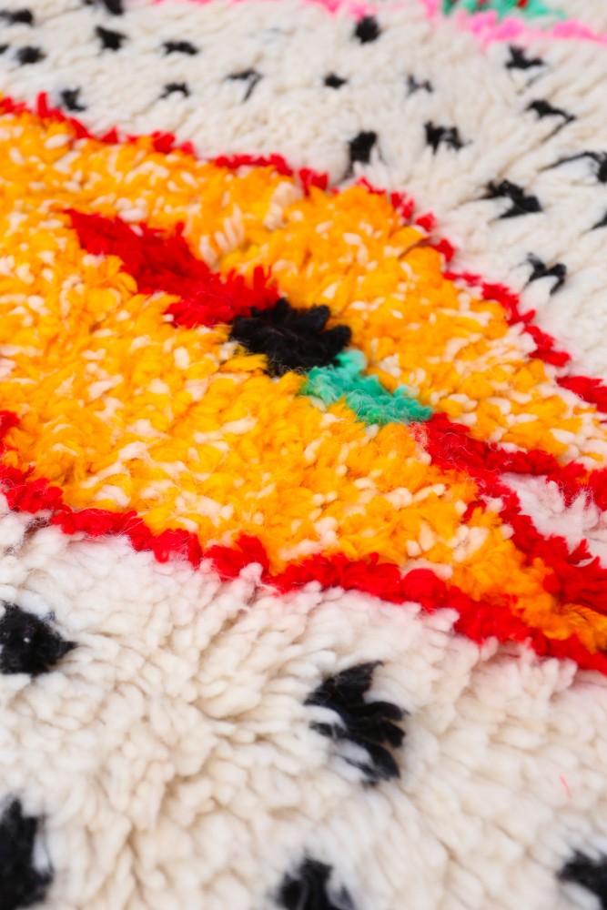 Questo tappeto berbero chiamato Azilal prende il nome dalla regione di Azilal in Marocco, dove è stato realizzato a mano su un telaio tradizionale in legno. I suoi motivi rappresentano gli stati d'animo, gli amori, i dolori della tessitrice al momento della sua creazione. Una volta che questo tappeto berbero colorato è stato creato, ne creerà un altro completamente diverso, in base alle sue emozioni del momento. Ogni pezzo è quindi unico.