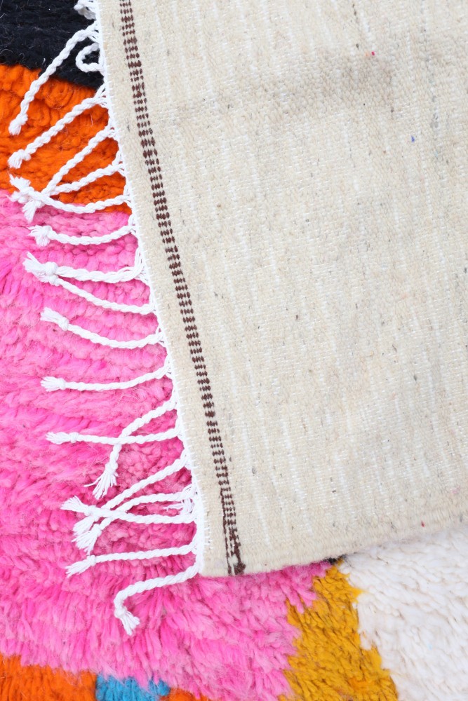 Questo tappeto berbero chiamato Azilal prende il nome dalla regione di Azilal in Marocco, dove è stato realizzato a mano su un telaio tradizionale in legno. I suoi motivi rappresentano gli stati d'animo, gli amori, i dolori della tessitrice al momento della sua creazione. Una volta che questo tappeto berbero colorato è stato creato, ne creerà un altro completamente diverso, in base alle sue emozioni del momento. Ogni pezzo è quindi unico.