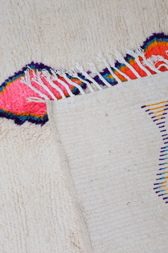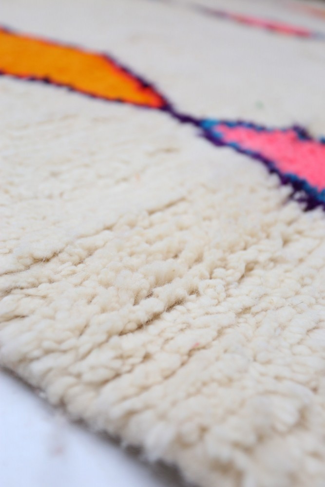 Questo tappeto berbero chiamato Azilal prende il nome dalla regione di Azilal in Marocco, dove è stato realizzato a mano su un telaio tradizionale in legno. I suoi motivi rappresentano gli stati d'animo, gli amori, i dolori della tessitrice al momento della sua creazione. Una volta che questo tappeto berbero colorato è stato creato, ne creerà un altro completamente diverso, in base alle sue emozioni del momento. Ogni pezzo è quindi unico.