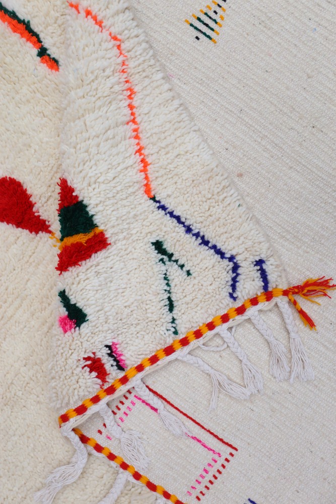 Questo tappeto berbero chiamato Azilal prende il nome dalla regione di Azilal in Marocco, dove è stato realizzato a mano su un telaio tradizionale in legno. I suoi motivi rappresentano gli stati d'animo, gli amori, i dolori della tessitrice al momento della sua creazione. Una volta che questo tappeto berbero colorato è stato creato, ne creerà un altro completamente diverso, in base alle sue emozioni del momento. Ogni pezzo è quindi unico.