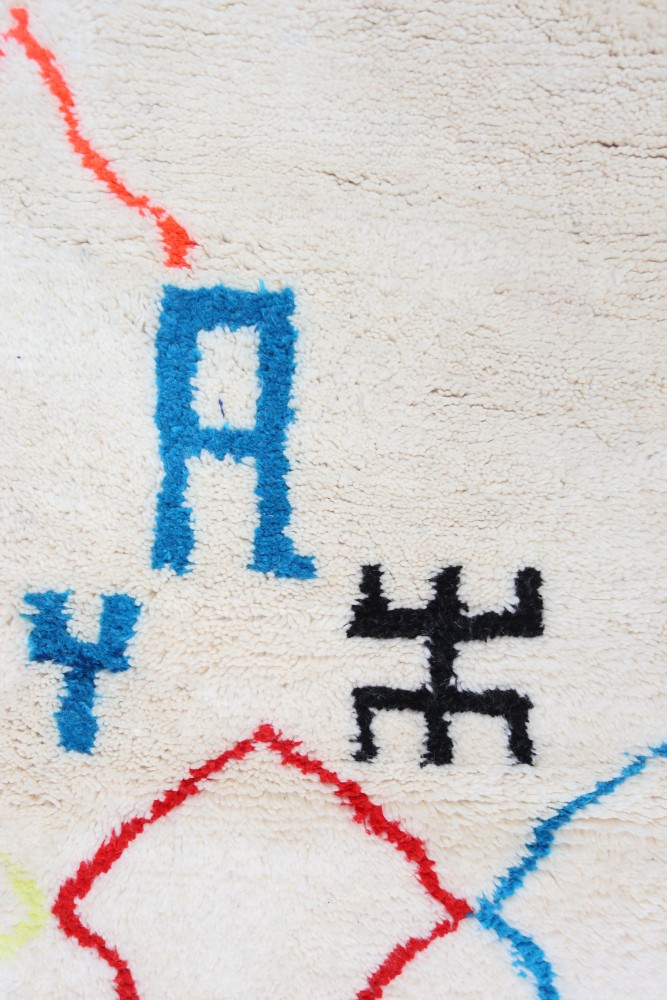 Questo tappeto berbero chiamato Azilal prende il nome dalla regione di Azilal in Marocco, dove è stato realizzato a mano su un telaio tradizionale in legno. I suoi motivi rappresentano gli stati d'animo, gli amori, i dolori della tessitrice al momento della sua creazione. Una volta che questo tappeto berbero colorato è stato creato, ne creerà un altro completamente diverso, in base alle sue emozioni del momento. Ogni pezzo è quindi unico.