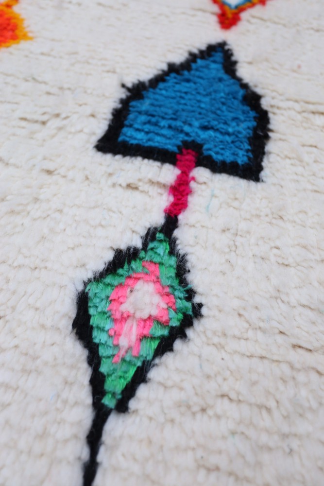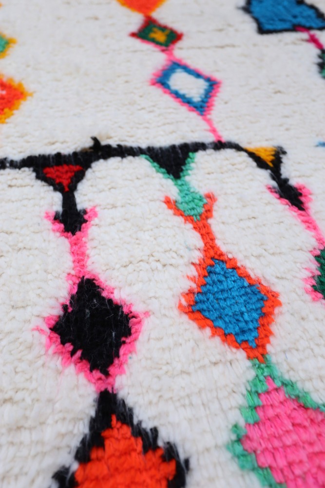 Questo tappeto berbero chiamato Azilal prende il nome dalla regione di Azilal in Marocco, dove è stato realizzato a mano su un telaio tradizionale in legno. I suoi motivi rappresentano gli stati d'animo, gli amori, i dolori della tessitrice al momento della sua creazione. Una volta che questo tappeto berbero colorato è stato creato, ne creerà un altro completamente diverso, in base alle sue emozioni del momento. Ogni pezzo è quindi unico.