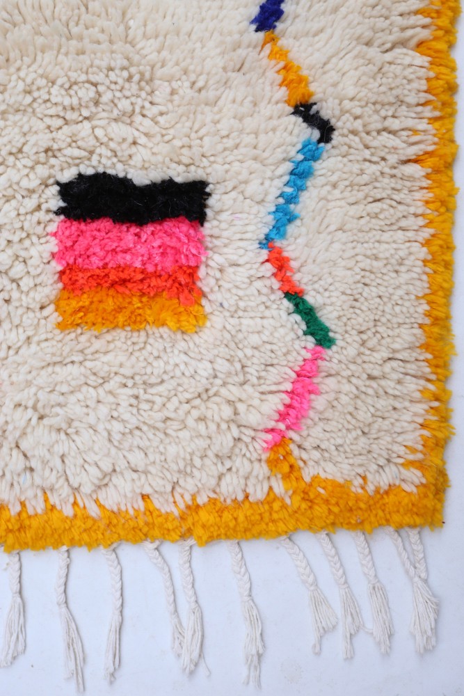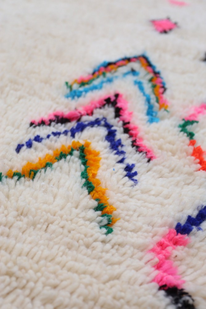 Questo tappeto berbero chiamato Azilal prende il nome dalla regione di Azilal in Marocco, dove è stato realizzato a mano su un telaio tradizionale in legno. I suoi motivi rappresentano gli stati d'animo, gli amori, i dolori della tessitrice al momento della sua creazione. Una volta che questo tappeto berbero colorato è stato creato, ne creerà un altro completamente diverso, in base alle sue emozioni del momento. Ogni pezzo è quindi unico.