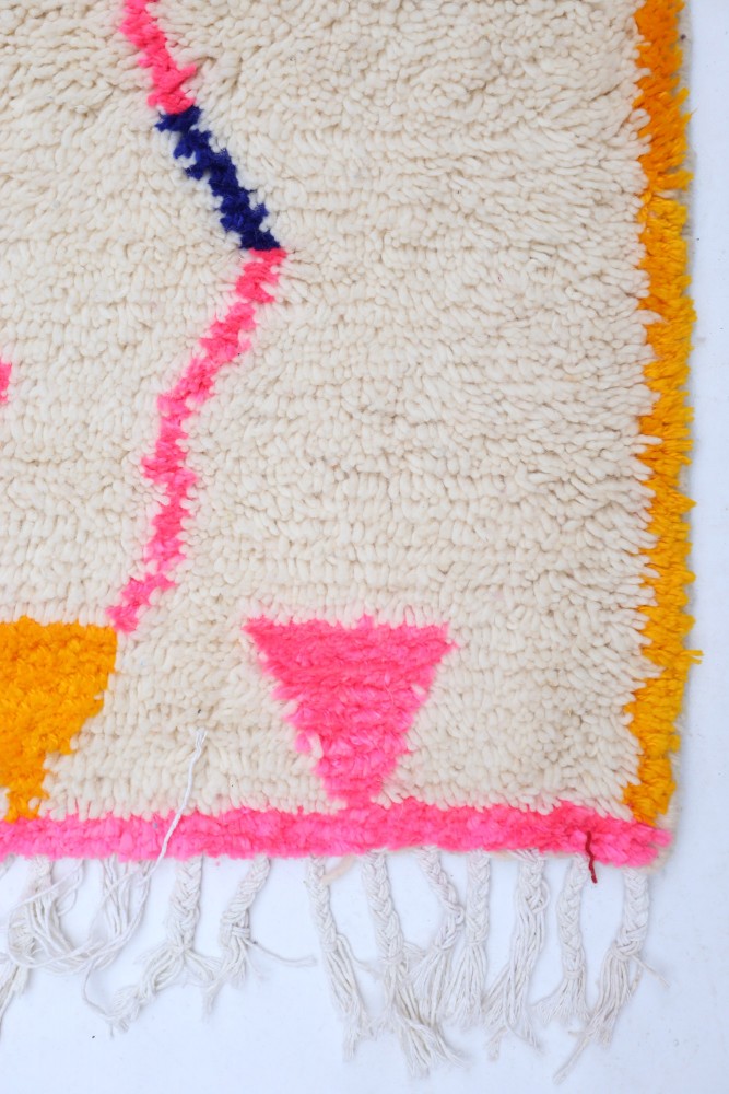 Questo tappeto berbero chiamato Azilal prende il nome dalla regione di Azilal in Marocco, dove è stato realizzato a mano su un telaio tradizionale in legno. I suoi motivi rappresentano gli stati d'animo, gli amori, i dolori della tessitrice al momento della sua creazione. Una volta che questo tappeto berbero colorato è stato creato, ne creerà un altro completamente diverso, in base alle sue emozioni del momento. Ogni pezzo è quindi unico.