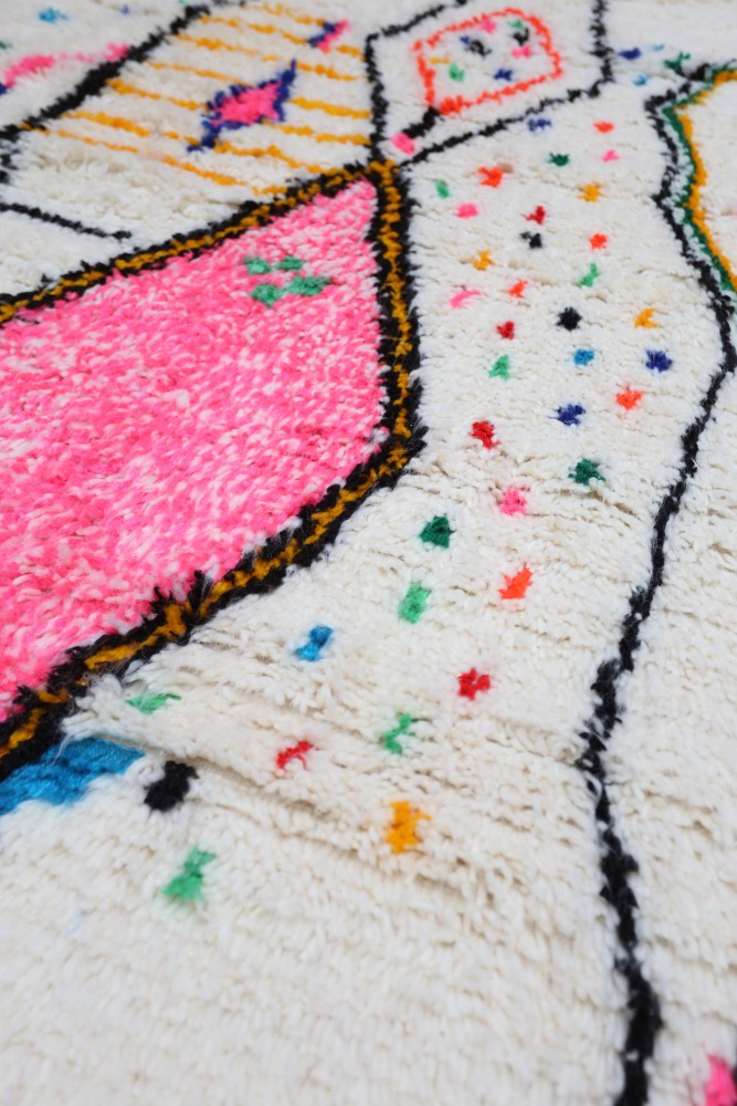 Questo tappeto berbero chiamato Azilal prende il nome dalla regione di Azilal in Marocco, dove è stato realizzato a mano su un telaio tradizionale in legno. I suoi motivi rappresentano gli stati d'animo, gli amori, i dolori della tessitrice al momento della sua creazione. Una volta che questo tappeto berbero colorato è stato creato, ne creerà un altro completamente diverso, in base alle sue emozioni del momento. Ogni pezzo è quindi unico.