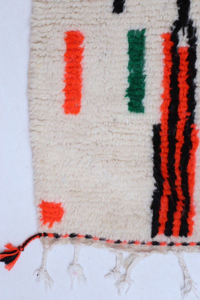 Questo tappeto berbero chiamato Azilal prende il nome dalla regione di Azilal in Marocco, dove è stato realizzato a mano su un telaio tradizionale in legno. I suoi motivi rappresentano gli stati d'animo, gli amori, i dolori della tessitrice al momento della sua creazione. Una volta che questo tappeto berbero colorato è stato creato, ne creerà un altro completamente diverso, in base alle sue emozioni del momento. Ogni pezzo è quindi unico.