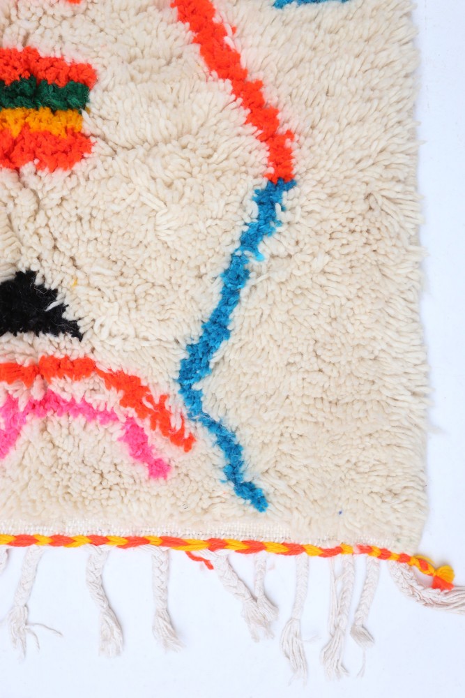 Questo tappeto berbero chiamato Azilal prende il nome dalla regione di Azilal in Marocco, dove è stato realizzato a mano su un telaio tradizionale in legno. I suoi motivi rappresentano gli stati d'animo, gli amori, i dolori della tessitrice al momento della sua creazione. Una volta che questo tappeto berbero colorato è stato creato, ne creerà un altro completamente diverso, in base alle sue emozioni del momento. Ogni pezzo è quindi unico.