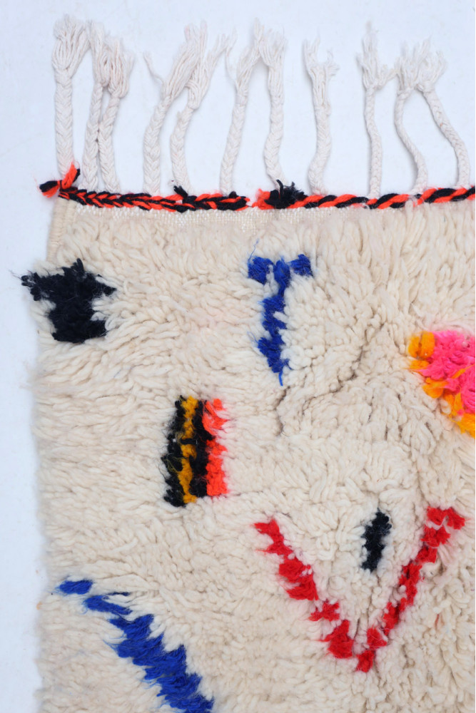 Questo tappeto berbero chiamato Azilal prende il nome dalla regione di Azilal in Marocco, dove è stato realizzato a mano su un telaio tradizionale in legno. I suoi motivi rappresentano gli stati d'animo, gli amori, i dolori della tessitrice al momento della sua creazione. Una volta che questo tappeto berbero colorato è stato creato, ne creerà un altro completamente diverso, in base alle sue emozioni del momento. Ogni pezzo è quindi unico.