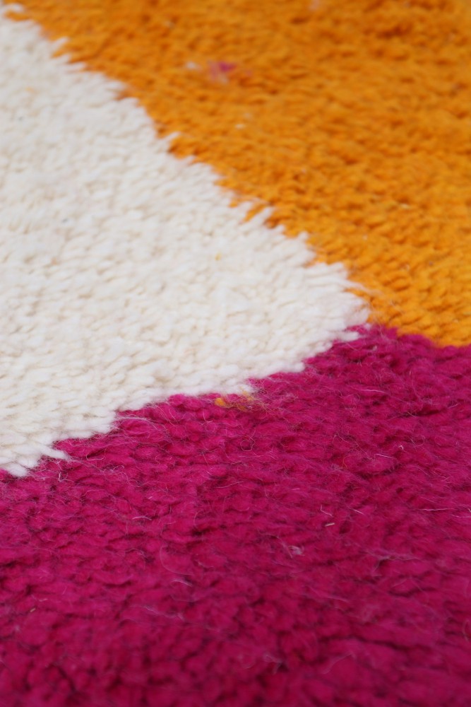 Uiteindelijk, laat je verleiden door het. Boujad tapijt, Een tapijt dat rijk is aan symboliek voor de weefsters van de Atlas. Ze laten hun creativiteit spreken met levendige kleuren en een moderne artistieke benadering. De kleurencombinaties lijken chaotisch en trekken meteen de aandacht. De vrouwen gebruiken gerecyclede materialen en textiel, maar ook katoen en wol. Het zijn kunstwerken die bruisen van vitaliteit en spontaniteit !