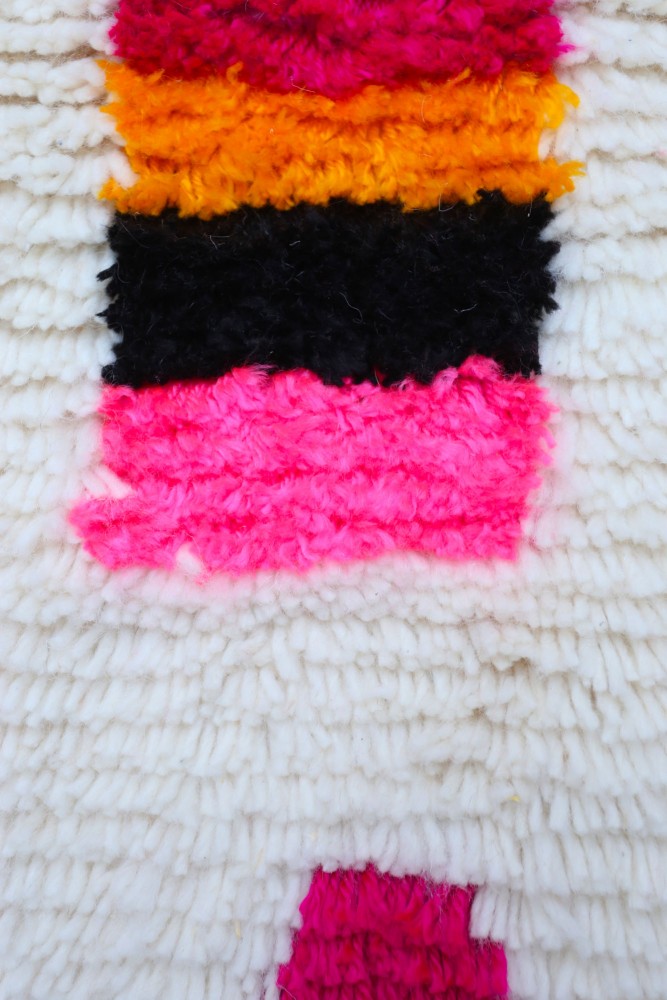 Deze Berberse tapijt genaamd Azilal dankt zijn naam aan de regio Azilal in Marokko waar het met de hand is geweven op een traditioneel houten weefgetouw. De patronen vertegenwoordigen de stemmingen, liefdes en verdriet van de weefster op het moment van creatie. Nadat dit gekleurde Berberse tapijt is gemaakt, zal ze een ander volledig verschillend tapijt maken, afhankelijk van haar emoties op dat moment. Elk stuk is dus uniek.