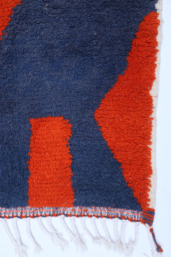 Groot modern Berber Azilal tapijt met vlakken in blauw en rood.