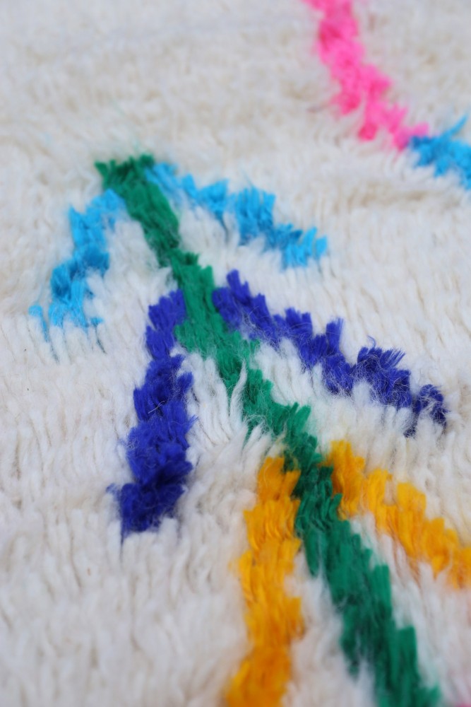Dit Berber-tapijt, genaamd Azilal, dankt zijn naam aan de regio Azilal in Marokko waar het met de hand is geweven op een traditioneel houten weefgetouw. De motieven vertegenwoordigen de stemmingen, liefdes en verdriet van de weefster op het moment van creatie. Nadat dit gekleurde Berber-tapijt is gemaakt, zal ze een ander, volledig verschillend tapijt maken, afhankelijk van haar emoties op dat moment. Elk stuk is dus uniek.