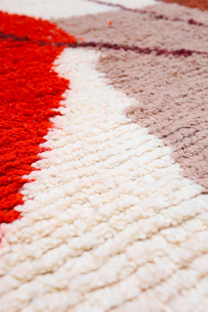 Deze Berber tapijt, genaamd Azilal, dankt zijn naam aan de regio Azilal in Marokko waar het met de hand is geweven op een traditioneel houten weefgetouw. De motieven vertegenwoordigen de stemmingen, liefdes en verdriet van de weefster op het moment van creatie. Nadat dit gekleurde Berber tapijt is gemaakt, zal ze een ander, volledig verschillend tapijt maken, afhankelijk van haar emoties op dat moment. Elk stuk is dus uniek.