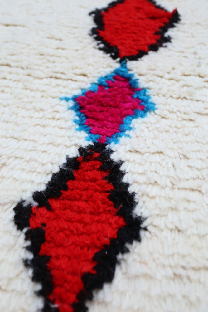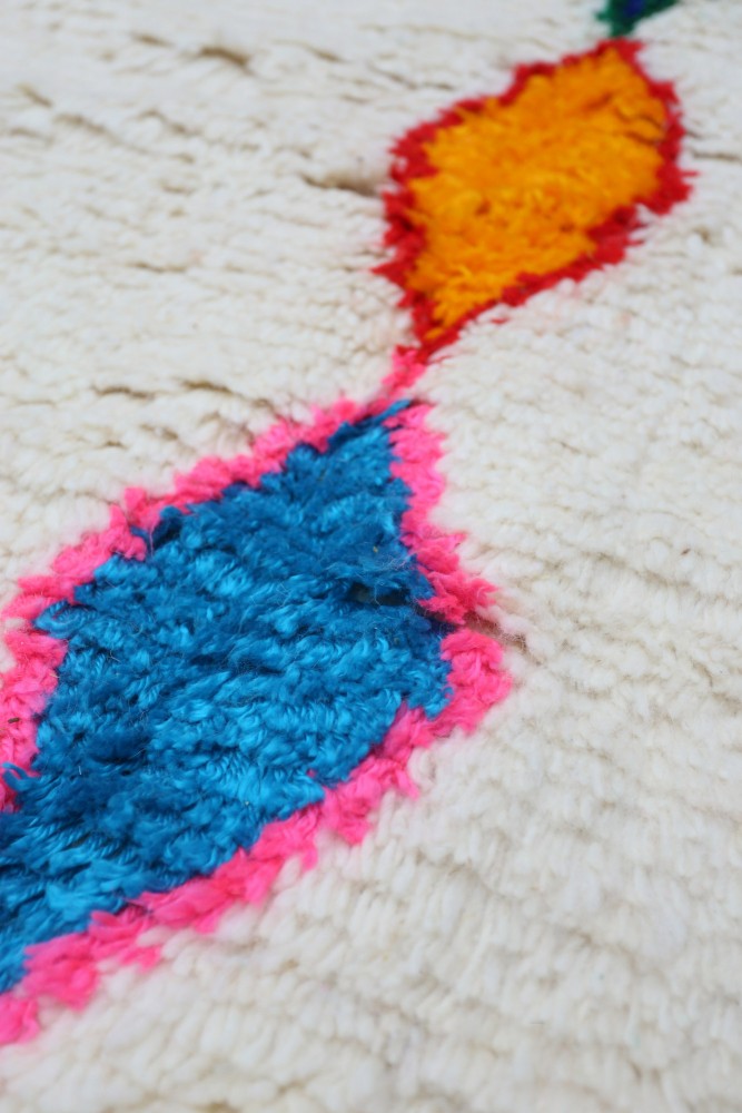 Deze Berberse tapijt genaamd Azilal dankt zijn naam aan de regio Azilal in Marokko waar het met de hand is geweven op een traditioneel houten weefgetouw. De patronen vertegenwoordigen de stemmingen, liefdes en verdriet van de weefster op het moment van creatie. Nadat dit gekleurde Berberse tapijt is gemaakt, zal ze een volledig ander tapijt maken, afhankelijk van haar emoties op dat moment. Elk stuk is dus uniek.