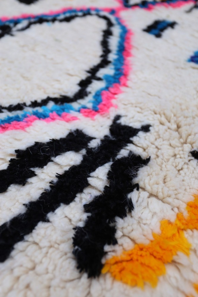 Deze Berberse tapijt genaamd Azilal dankt zijn naam aan de regio Azilal in Marokko waar het met de hand is geweven op een traditioneel houten weefgetouw. De patronen vertegenwoordigen de stemmingen, liefdes en verdriet van de weefster op het moment van creatie. Nadat dit gekleurde Berberse tapijt is gemaakt, zal ze een volledig ander tapijt maken, afhankelijk van haar emoties op dat moment. Elk stuk is dus uniek.