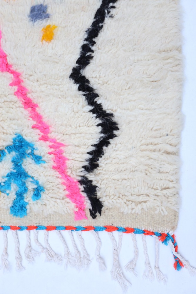 Deze Berberse tapijt genaamd Azilal dankt zijn naam aan de regio Azilal in Marokko waar het met de hand is geweven op een traditioneel houten weefgetouw. De patronen vertegenwoordigen de stemmingen, liefdes en verdriet van de weefster op het moment van creatie. Nadat dit gekleurde Berberse tapijt is gemaakt, zal ze een volledig ander tapijt maken, afhankelijk van haar emoties op dat moment. Elk stuk is dus uniek.