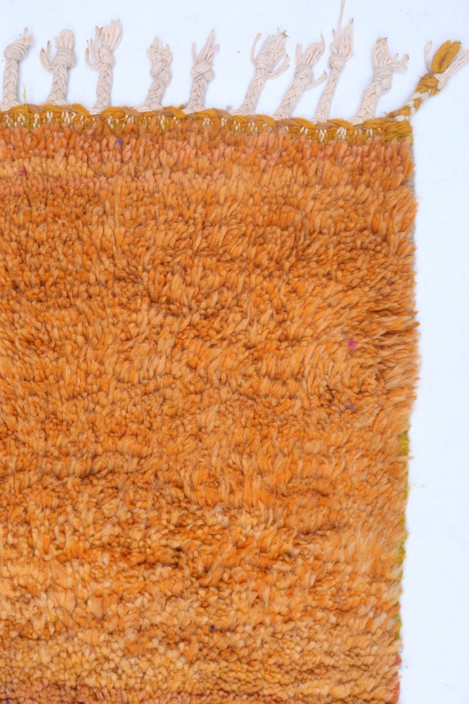 Deze Berber tapijt, genaamd Azilal, dankt zijn naam aan de regio Azilal in Marokko waar het met de hand is geweven op een traditioneel houten weefgetouw. De motieven vertegenwoordigen de stemmingen, liefdes en verdriet van de weefster op het moment van creatie. Nadat dit gekleurde Berber tapijt is gemaakt, zal ze een ander, volledig verschillend tapijt maken, afhankelijk van haar emoties op dat moment. Elk stuk is dus uniek.