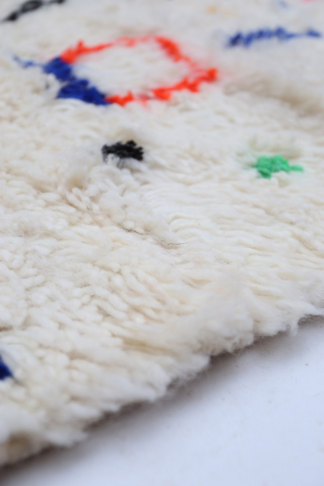 Deze Berberse tapijt genaamd Azilal dankt zijn naam aan de regio Azilal in Marokko waar het met de hand is geweven op een traditioneel houten weefgetouw. De patronen vertegenwoordigen de stemmingen, liefdes en verdriet van de weefster op het moment van creatie. Nadat dit gekleurde Berberse tapijt is gemaakt, zal ze een volledig ander tapijt maken, afhankelijk van haar emoties op dat moment. Elk stuk is dus uniek.
