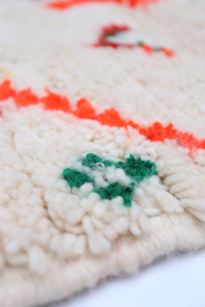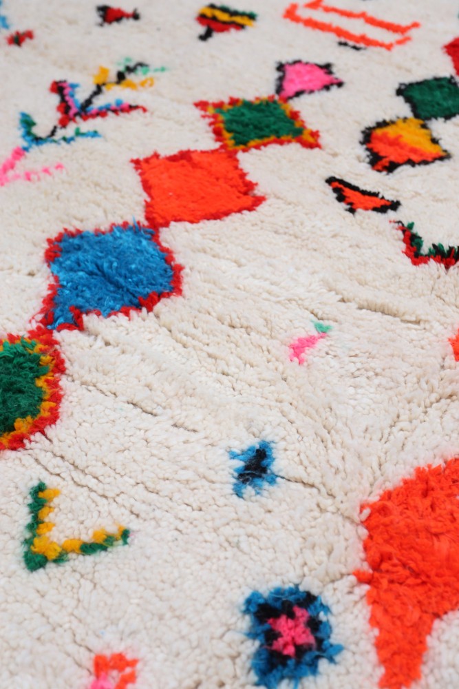 Deze Berberse tapijt genaamd Azilal dankt zijn naam aan de regio Azilal in Marokko waar het met de hand is geweven op een traditioneel houten weefgetouw. De patronen vertegenwoordigen de stemmingen, liefdes en verdriet van de weefster op het moment van creatie. Nadat dit gekleurde Berberse tapijt is gemaakt, zal ze een volledig ander tapijt maken, afhankelijk van haar emoties op dat moment. Elk stuk is dus uniek.