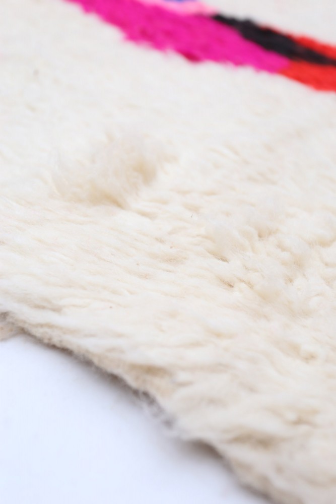 Deze Berberse tapijt genaamd Azilal dankt zijn naam aan de regio Azilal in Marokko waar het met de hand is geweven op een traditioneel houten weefgetouw. De patronen vertegenwoordigen de stemmingen, liefdes en verdriet van de weefster op het moment van creatie. Nadat dit gekleurde Berberse tapijt is gemaakt, zal ze een volledig ander tapijt maken, afhankelijk van haar emoties op dat moment. Elk stuk is dus uniek.