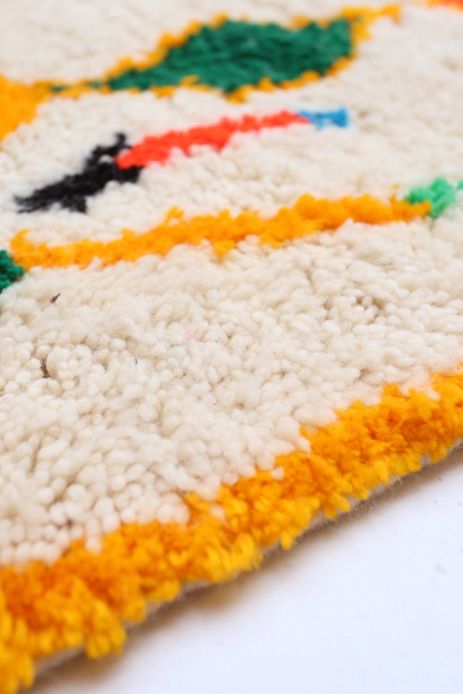 Deze Berberse tapijt genaamd Azilal dankt zijn naam aan de regio Azilal in Marokko waar het met de hand is geweven op een traditioneel houten weefgetouw. De patronen vertegenwoordigen de stemmingen, liefdes en verdriet van de weefster op het moment van creatie. Nadat dit gekleurde Berberse tapijt is gemaakt, zal ze een volledig ander tapijt maken, afhankelijk van haar emoties op dat moment. Elk stuk is dus uniek.