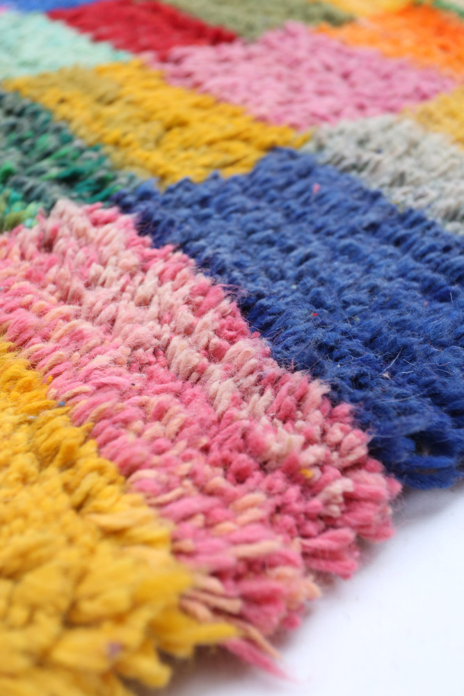 Deze Berberse tapijt genaamd Azilal dankt zijn naam aan de regio Azilal in Marokko waar het met de hand is geweven op een traditioneel houten weefgetouw. De patronen vertegenwoordigen de stemmingen, liefdes en verdriet van de weefster op het moment van creatie. Nadat dit gekleurde Berberse tapijt is gemaakt, zal ze een volledig ander tapijt maken, afhankelijk van haar emoties op dat moment. Elk stuk is dus uniek.