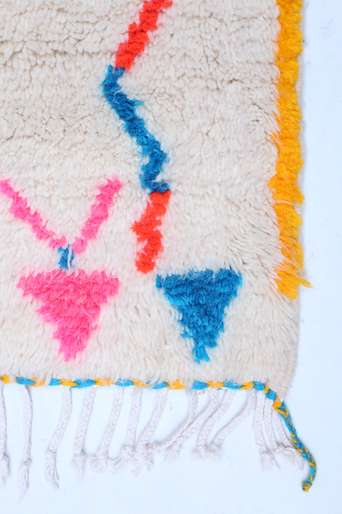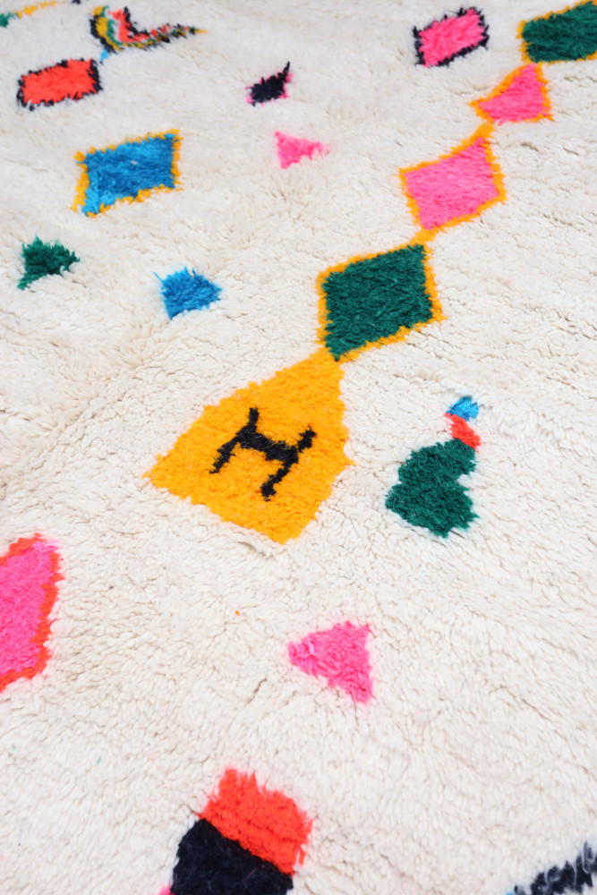 Deze Berberse tapijt genaamd Azilal dankt zijn naam aan de regio Azilal in Marokko waar het met de hand is geweven op een traditioneel houten weefgetouw. De patronen vertegenwoordigen de stemmingen, liefdes en verdriet van de weefster op het moment van creatie. Nadat dit gekleurde Berberse tapijt is gemaakt, zal ze een volledig ander tapijt maken, afhankelijk van haar emoties op dat moment. Elk stuk is dus uniek.