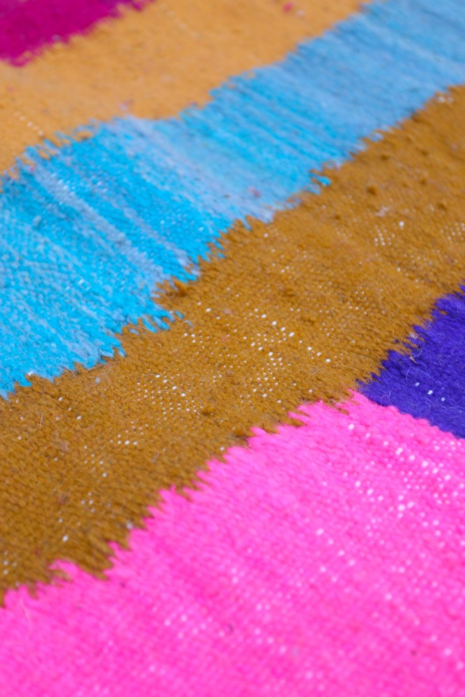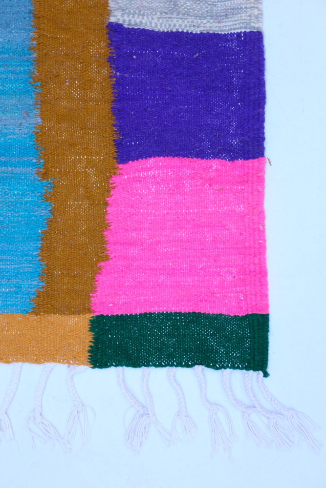Deze Berberse tapijt genaamd Azilal dankt zijn naam aan de regio Azilal in Marokko waar het met de hand is geweven op een traditioneel houten weefgetouw. De patronen vertegenwoordigen de stemmingen, liefdes en verdriet van de weefster op het moment van creatie. Nadat dit gekleurde Berberse tapijt is gemaakt, zal ze een volledig ander tapijt maken, afhankelijk van haar emoties op dat moment. Elk stuk is dus uniek.