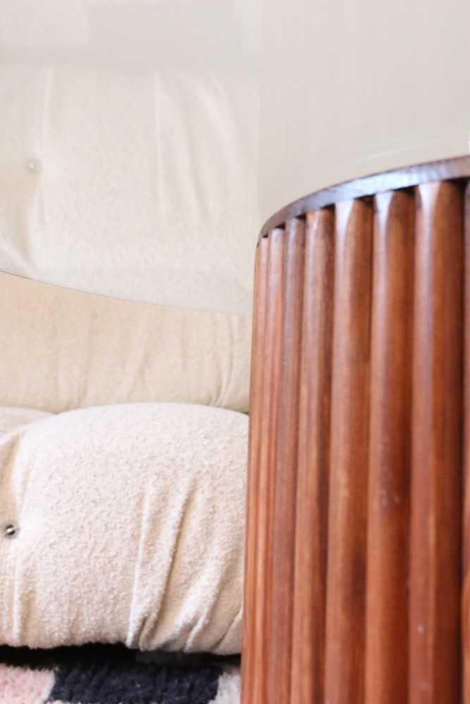 Salontafel van glas en rood dennenhout ontworpen door Marion, de oprichter van THEM, en volledig ambachtelijk vervaardigd in Marokko in een van onze getalenteerde partnerateliers.