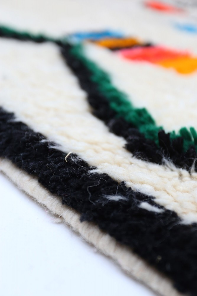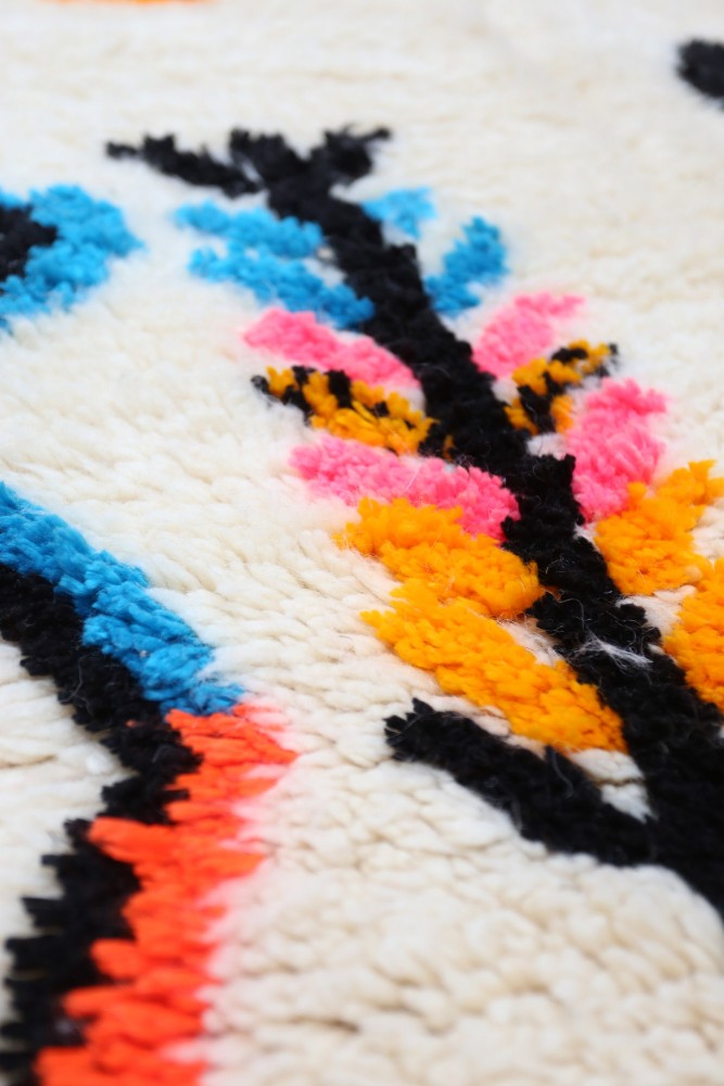Dit Berber tapijt, genaamd Azilal, dankt zijn naam aan de regio Azilal in Marokko waar het met de hand is geweven op een traditioneel houten weefgetouw. De motieven vertegenwoordigen de stemmingen, liefdes en verdriet van de weefster op het moment van creatie. Nadat dit gekleurde Berber tapijt is gemaakt, zal ze een ander totaal verschillend tapijt maken, afhankelijk van haar emoties op dat moment. Elk stuk is dus uniek.