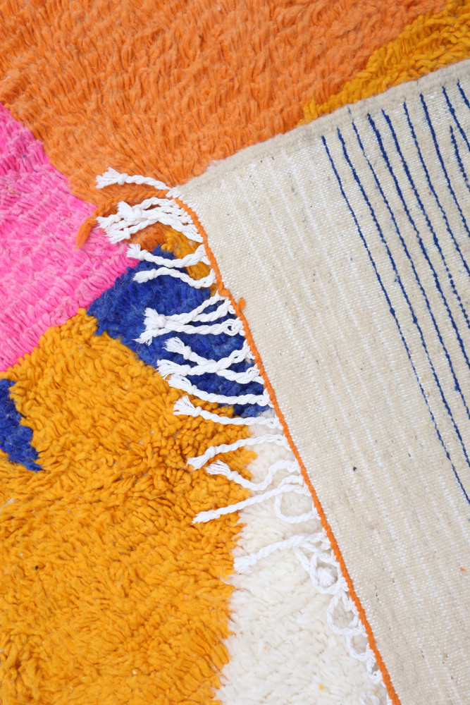 Deze Berberse tapijt genaamd Azilal dankt zijn naam aan de regio Azilal in Marokko waar het met de hand is geweven op een traditioneel houten weefgetouw. De patronen vertegenwoordigen de stemmingen, liefdes en verdriet van de weefster op het moment van creatie. Nadat dit gekleurde Berberse tapijt is gemaakt, zal ze een volledig ander tapijt maken, afhankelijk van haar emoties op dat moment. Elk stuk is dus uniek.